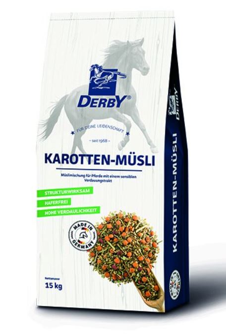 Karotten müsli od Derby® je müsli bez ovsa s přirozenou chutí sušených mrkví, červené řepy a svatojánského chlebíčku. Voňavé seno z vojtěšky a slunečnicová semínka podporují citlivý trávicí trakt u koní. V kombinaci s cenným lněným šrotem je příznivě ovlivněna tvorba ochranného filmu ve střevě.