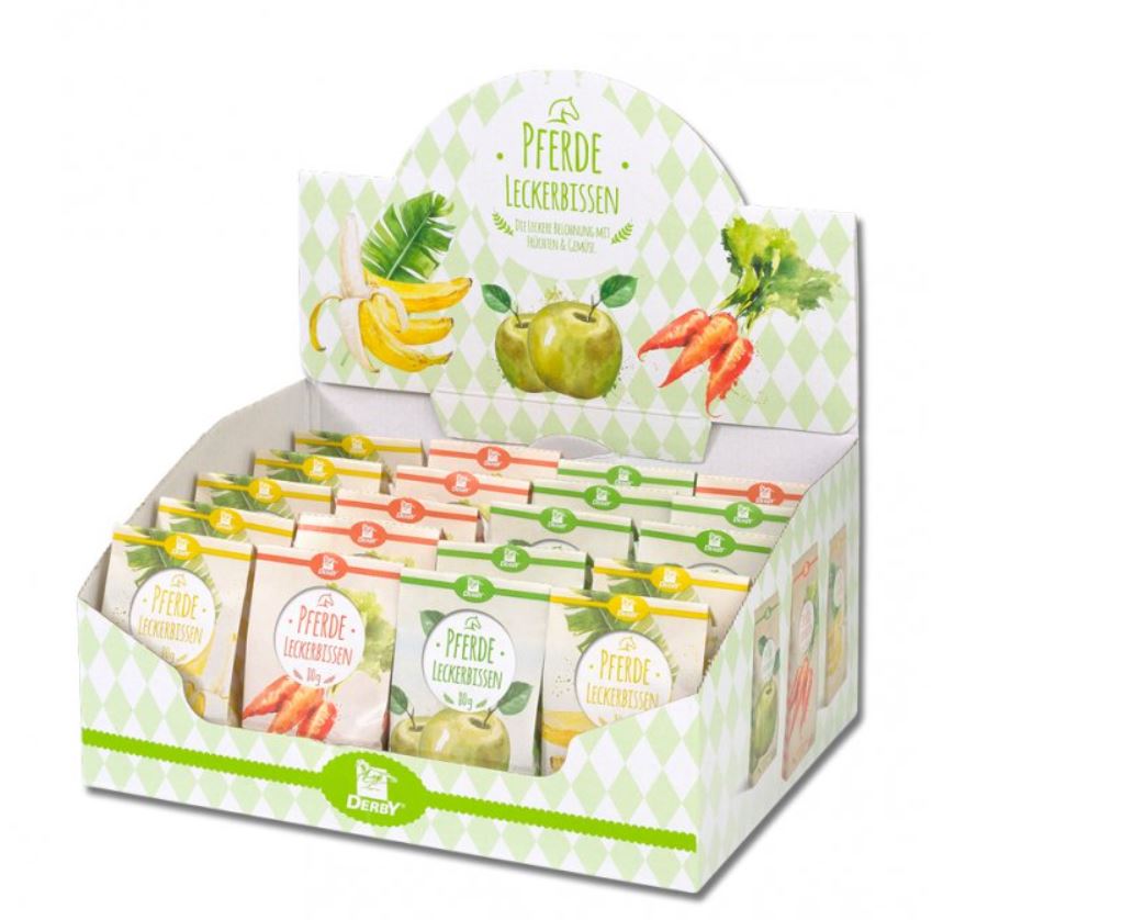 Leckerbissen Display, 20 x 80 g mix od Derby, krabice mini pamlsků pro koně s mixem příchutí: banán, mrkev, jablko. Krásná krabička plná pamlsků může být skvělým dárkem.