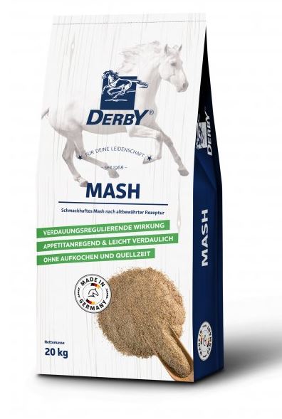 DERBY® Mash odpovídá nejoriginálnější staré receptuře. Prostřednictvím slizu lněného semene je střevní sliznice chráněna, Mash díky svému složení snižuje riziko koliky a zácpy. Další výhodou je praktické použití: Jako okamžitě rozpustnou kaši jednoduše přelijeme vlažnou vodou, zamícháme a podáváme, zdlouhavé vaření není nutné. Recept je chutný a podporuje jak línání tak i regeneraci po zvýšené zátěži.
