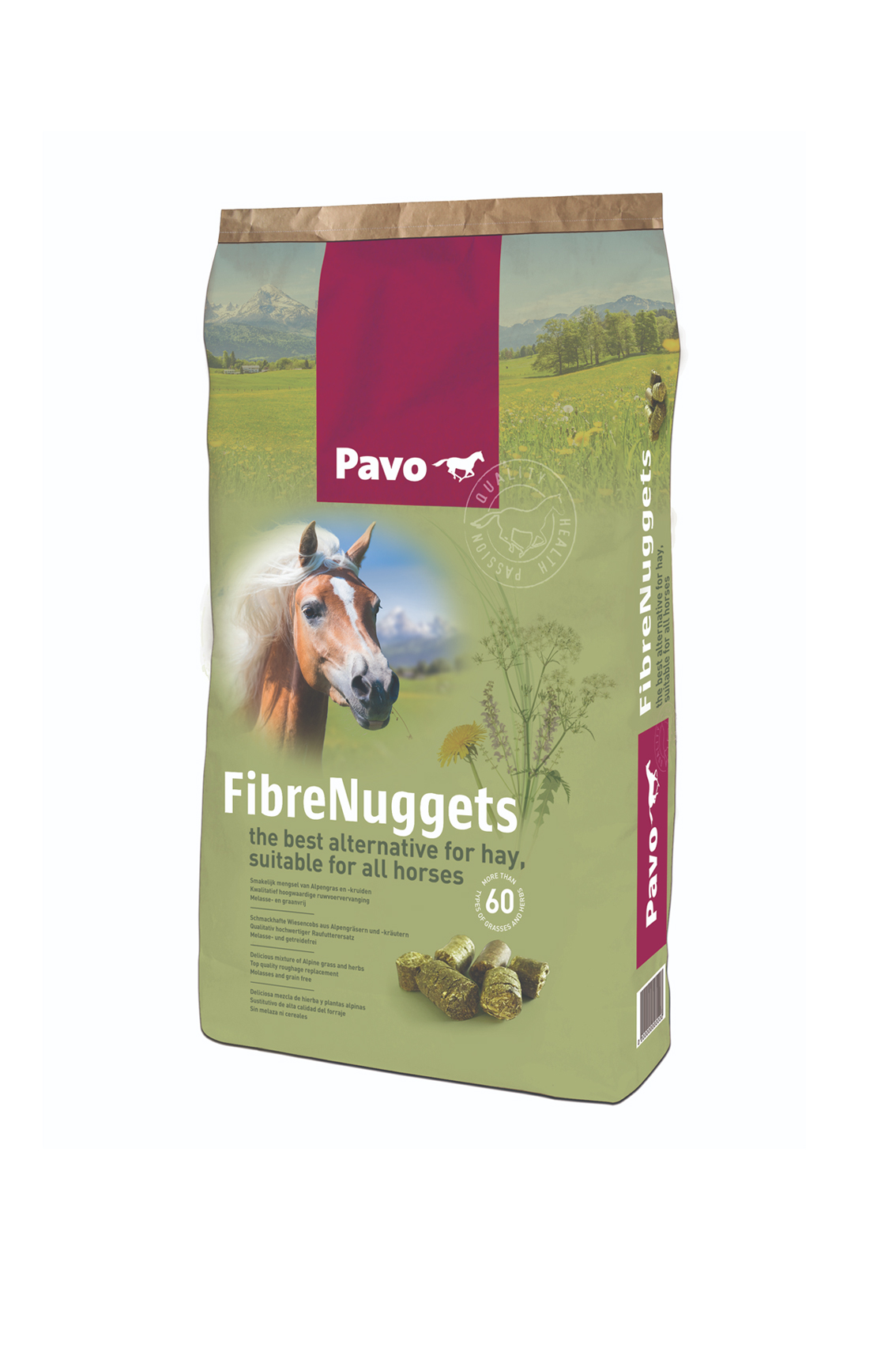 Krmivo Pavo FibreNuggets lze použít jako vysoce kvalitní náhradu sena. Velké pelety s vysokým obsahem vlákniny, vyrobené ze 100% travin z pastvin z alpského podhůří v jižním Německu, u vašeho koně stimulují žvýkání a slinění. Více žvýkání zabraňuje nudě a sliny podporují zdravé trávení. Voňavá a chutná tráva z pastvin obsahuje více než 60 různých druhů travin a bylin. Je bohatá na vlákninu, přírodní vitamíny a stopové prvky a je zcela bez melasy a obilovin. Díky řízenému procesu sušení má krmivo FibreNuggets vysoce konzistentní kvalitu bez plísní či prachu. To z něj také činí ideální náhradu pro koně citlivé na prach a/nebo plísně.