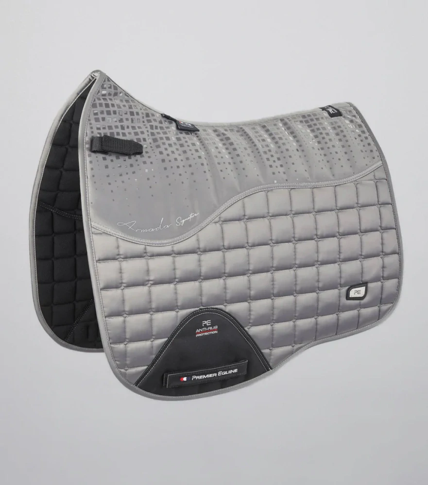 Podsedlová drezurní dečka , vyrobená z luxusní prošívané saténové vnější tkaniny, která se elegantně leskne ve světle, může se pochlubit charakteristickým stylem pro nejvyšší povrchovou úpravu.