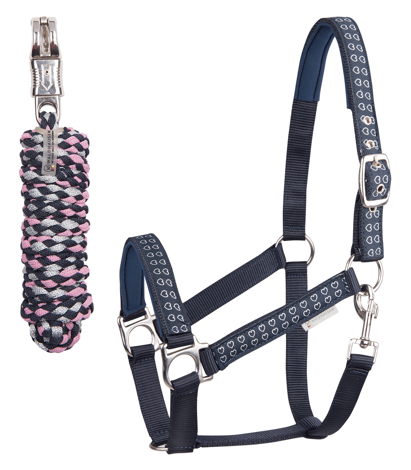 Sada se skládá z ohlávky se stříbrným designem srdce a 3-barevného vodítka s lesklou panic karabinou. Ohlávka je jemně polstrovaná na nose, lícnicích a temeni.