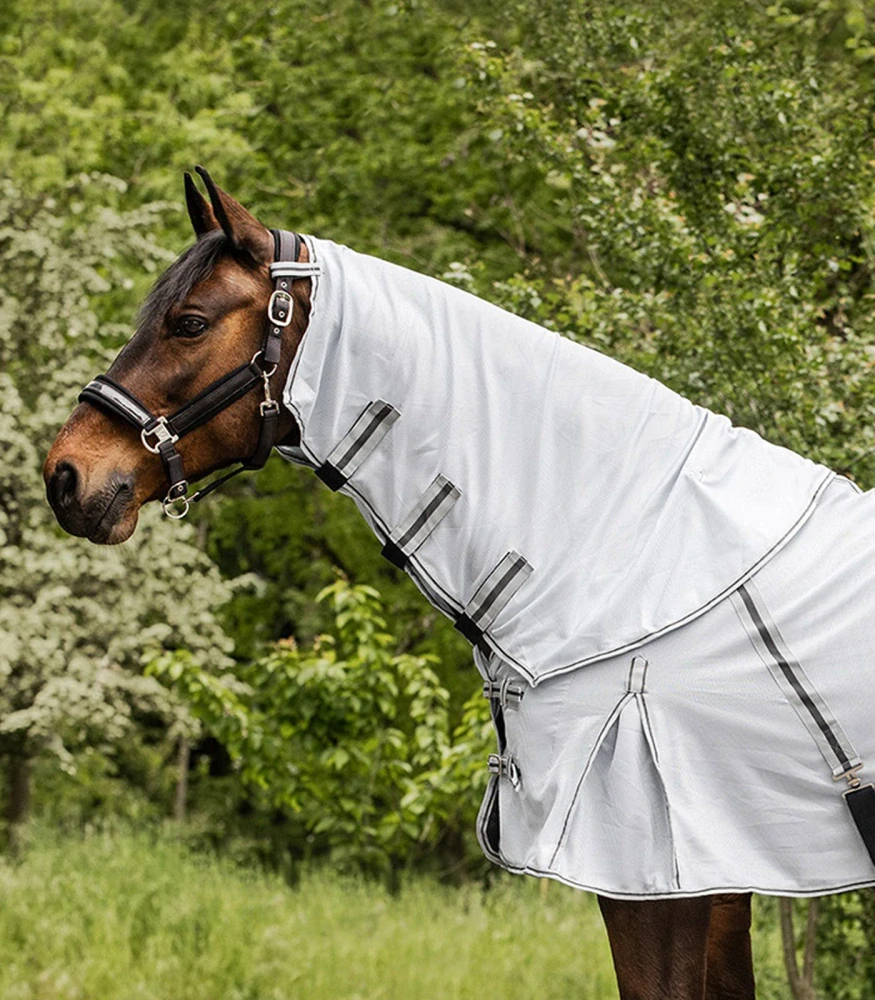- Vysoce kvalitní krční díl vyrobený z jemně síťované tkaniny, který chrání krk a hřívu před nepříjemným hmyzem. Díky třem pevným upevňovacím prvkům na dotykovou pásku a upevňovacím popruhům pro ohlávku nebo uzdečku, zajišťuje dokonalé uchycení krku a bezpečné držení.