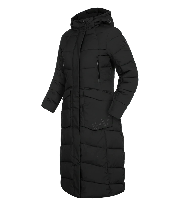 Dlouhý prošívaný kabát s výplní připomínající peří a rozsáhlými rysy