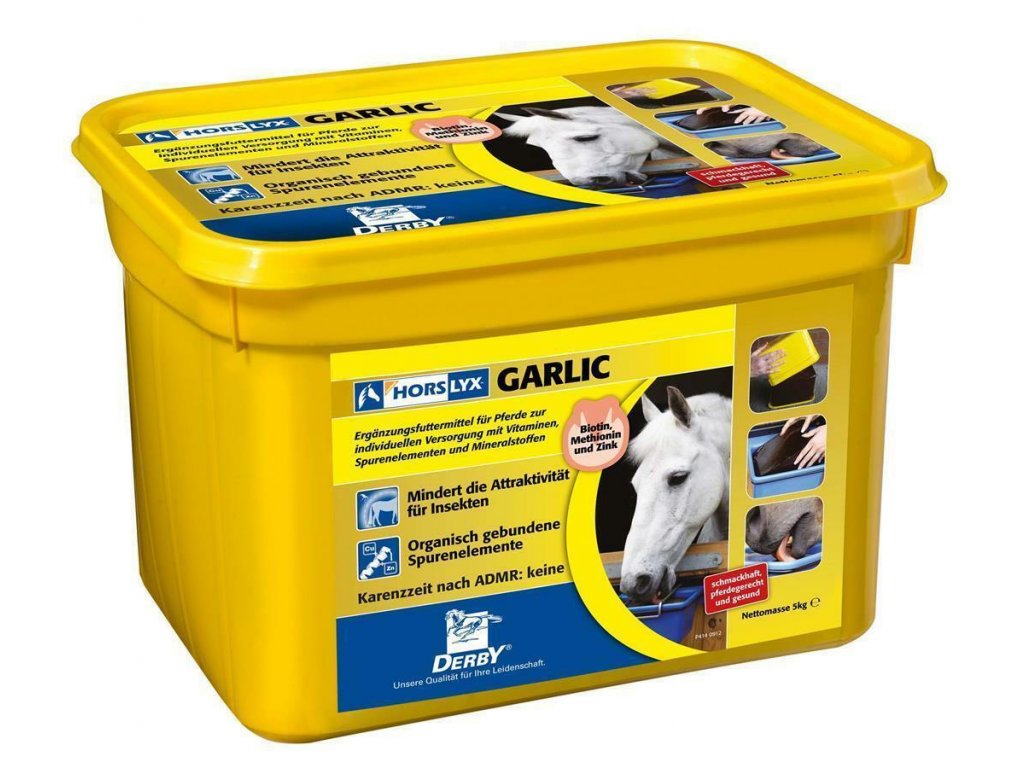 HORSLYX Garlic je velmi chutný liz s česnekem, který je odolný vůči povětrnostním vlivům. Patentovaný výrobní proces umožňuje vyrábět Horslyx Garlic bez chemických pojiv, konzervantů nebo plnidel z výroby obilovin. Díky Horslyx Garlic je možné předejít nedostatku živin, a tak přispět ke zdraví a blahu u koně. Kromě toho může díky speciálnímu složení přispět při problémech způsobených bodnutím a zmírnit obtěžování sajícím hmyzem, protože díky složení snižuje přitažlivost hmyzu.