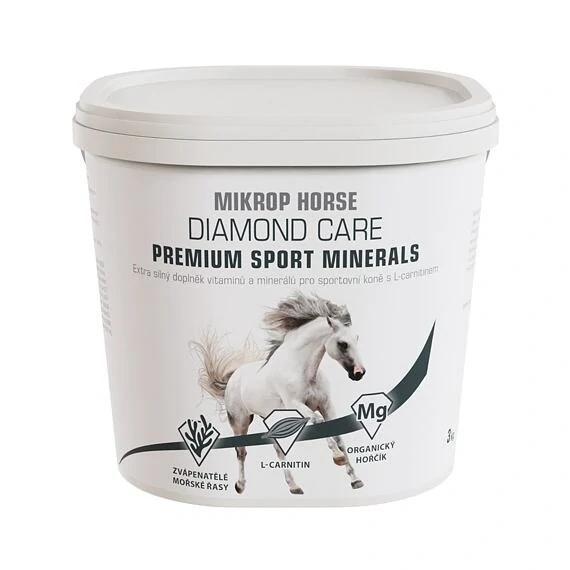 MIKROP® HORSE DIAMOND CARE PREMIUM SPORT MINERALS s L-karnitinem je prémiový vysoce koncentrovaný sypký vitamino-minerální přípravek s vysokým obsahem organicky vázaných látek, vitaminů, mikroprvků a esenciálních aminokyselin, receptura je přizpůsobena potřebám sportovních koní ve střední, vysoké a velmi vysoké zátěži. Doplněk je zcela bezobilný.