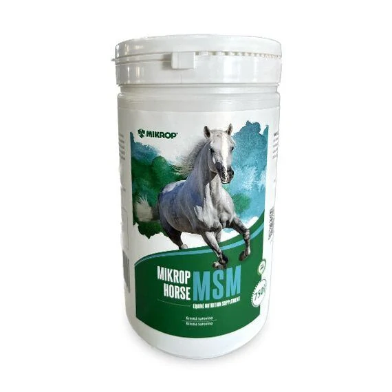 HORSE MSM je krmná surovina určená pro koně. MSM neboli methylsulfonylmethan je organická sloučenina síry, která napomáhá s potíži pohybového aparátu. Je určená pro koně v zájmovém chovu i pro sportovní koně. MSM je přírodní protizánětlivá krmná surovina, která má pozitivní efekt při potížích kloubů, vazů a šlach. MSM zlepšuje fyzickou kondici koně a svými vlastnostmi napomáhá k lepší regeneraci po zátěži a hojení ran. Díky svému složení napomáhá k zpevnění šlach a vazů. MSM je vhodně pro všechny věkové kategorie koní. Dále MSM neobsahuje žádné zakázané látky.