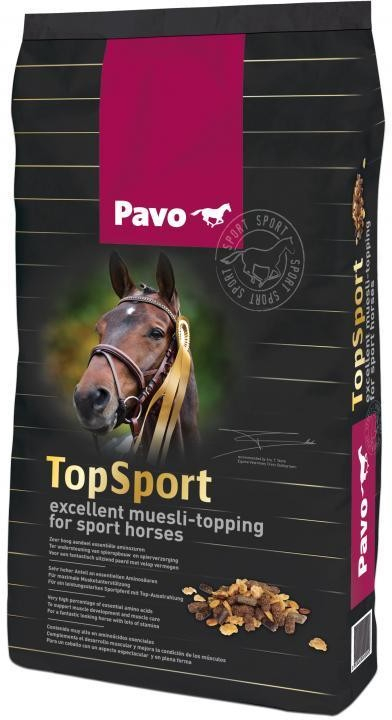 Objemné krmivo – jak ukazují výzkumy Pavo, kvalita objemného krmiva je stále nižší a nižší. Proto se Pavo rozhodlo, ve spolupráci s nejlepšími veterinárními lékaři a top mezinárodními jezdci, vyvinout nové krmivo, které by tento problém řešilo. Pavo TopSport je müsli – pro TOP koně, jejichž výkonnost je na vysoké úrovni a nebo pro koně, kteří mají malý nebo vůbec žádný přístup na pastvu a dostávají objemné krmivo velmi nízké kvality. Pavo TopSport poskytuje 20 % hrubého proteinu pro maximální svalovou podporu a 18 % oleje pro více energie a vytrvalosti. Jezdci, kteří Pavo TopSport testovali, říkají: „Moji koně vypadají fantasticky, mají mnohem větší výdrž a silné svaly." Důležité vlastnosti -