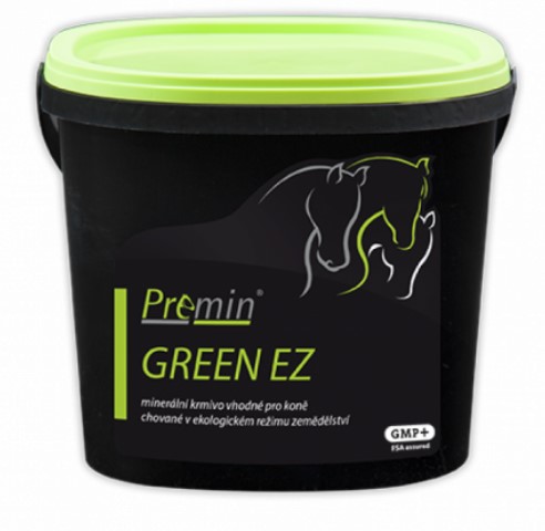 Minerálně-vitamínové krmivo Premin® Green EZ je určené pro všechny kategorie koní v zájmovém chovu. Vitamínovým a minerálním složením pokrývá biologickou potřebu koně a zároveň je obohaceno stopovými prvky, potřebnými pro správnou funkci organismu v požadované zátěži. Doplněk kvasinek zlepšuje trávení vlákniny, čímž i minerální látky z podaného krmiva jsou lépe využívány. Minerální krmivo je vhodné do ekologických chovů.