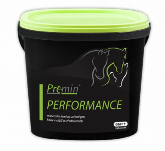 Premin® PERFORMANCE je minerální krmivo určené pro koně v zájmovém chovu v nižší a střední zátěži. Vitamínovým a minerálním složením pokrývá denní biologickou potřebu koně a zároveň je obohaceno esenciálními aminokyselinami a organicky vázanými prvky, potřebnými pro správnou funkci organismu v požadované zátěži. Minerální krmivo obsahuje L-karnitin, který je důležitou součástí jak srdeční, tak kosterní svaloviny, pomáhá štěpení tuků a stává se tak nezanedbatelným nosičem energie. Doplněk kvasinek zlepšuje trávení vlákniny, také mikro i makroprvky jsou z krmiva lépe využívány.