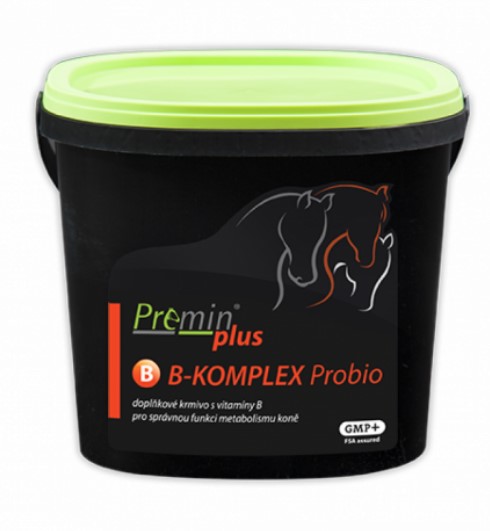 Doplňkové krmivo Premin® plus B-komplex Probio je určeno k doplnění hladiny vitamínů skupiny B v krmné dávce koní. Vitamíny skupiny B fungují především jako katalyzátory metabolismu proteinů, tuků a cukrů a hrají roli v utváření tkání z živin, které kůň přijme v krmivu. Potřeba vitamínů B roste při zvýšené fyzické zátěži, březosti a laktaci, při výskytu parazitů v organismu, při výskytu mykotoxinů v krmivu a při podávání antibiotik. Přídavek vitamínů B je vhodný také při průjmových onemocněních, kdy se celkově snižuje jejich biosyntéza a vstřebatelnost ve střevech. Stejně tak je vhodné doplňovat hladinu vitamínů B u starých koní se sníženou funkčností trávicího traktu.
