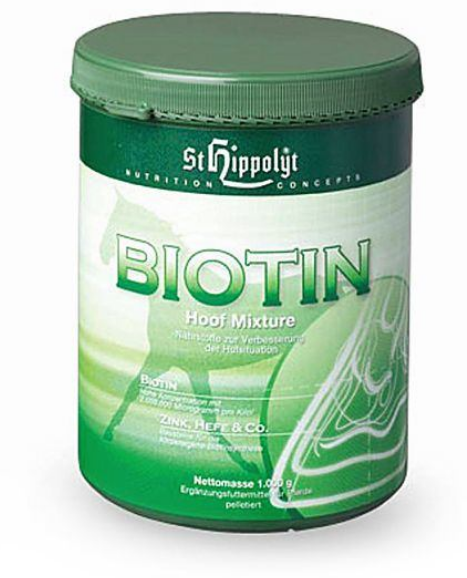 Biotin – směs pro kopyta je zdařilá kombinace biotinu, pšeničných výhonků bohatých na životně důležité látky, zvláště účinných složek s vitamíny a stopovými prvky a vybraných bylin podporujících trávení a látkovou výměnu. To vše umožňuje výrobu tělu vlastního biotinu. Organicky vázaný zinek, pivovarské kvasnice, fermentované obilí, obilné klíčky a lněné semínko, síru obsahující aminokyseliny a semeno černuchy dělají ze směsi pro kopyta Biotin harmonický koncert výživných látek působících na vývoj kopyt.