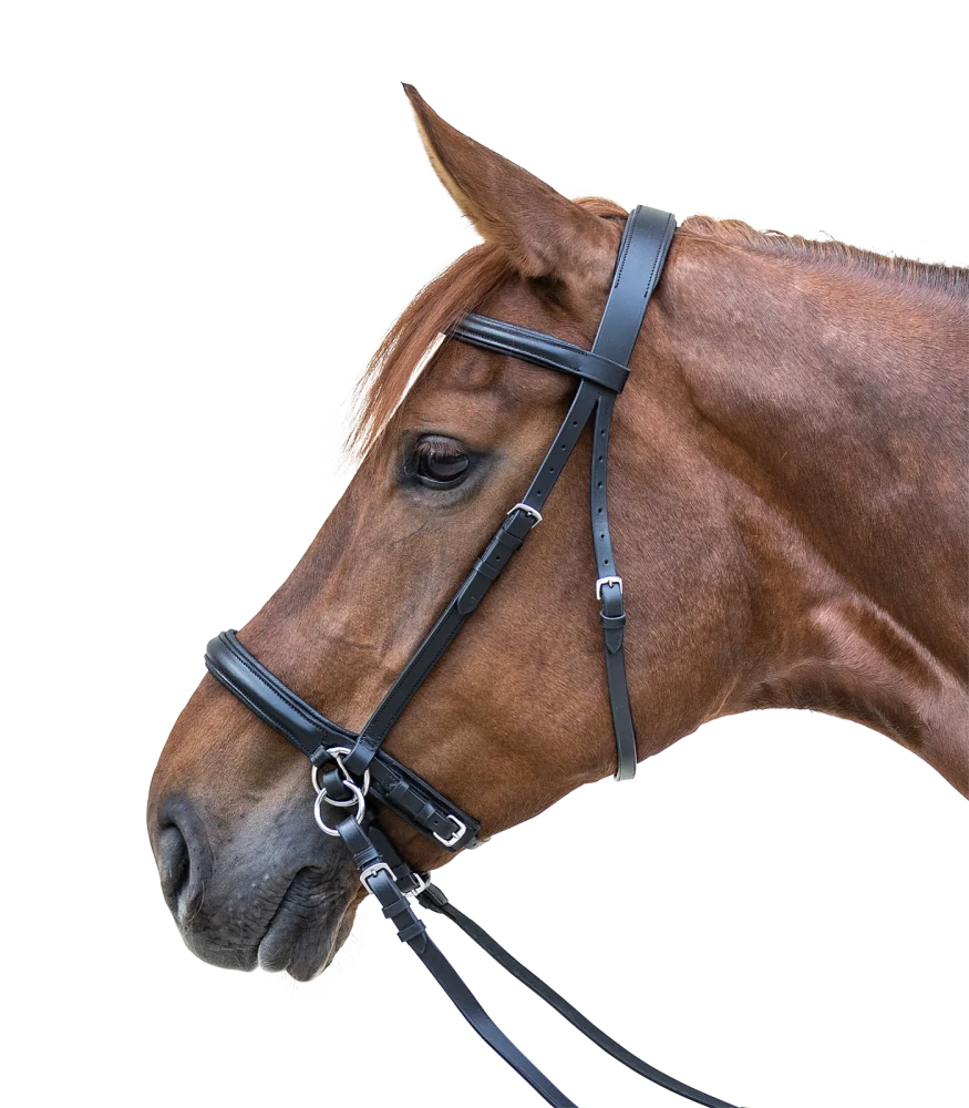 Bezudidlová uzdečka s efektem scawbrigu (efekt přes čelist). Měkké polstrování na nose a nánosníku. Vítaná změna oproti uzdečce pro dobře trénované koně.