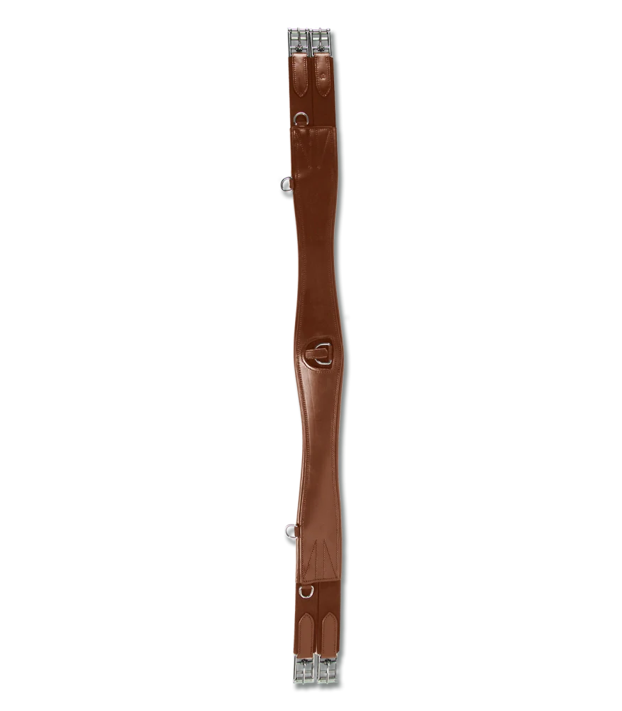 Měkce podšitý podbřišník vyrobený z kvalitní kůže, odolný a tvarově stálý. S nerezovými válečkovými přezkami, elastickou vložkou na obou koncích a kroužky pro pomocné otěže.