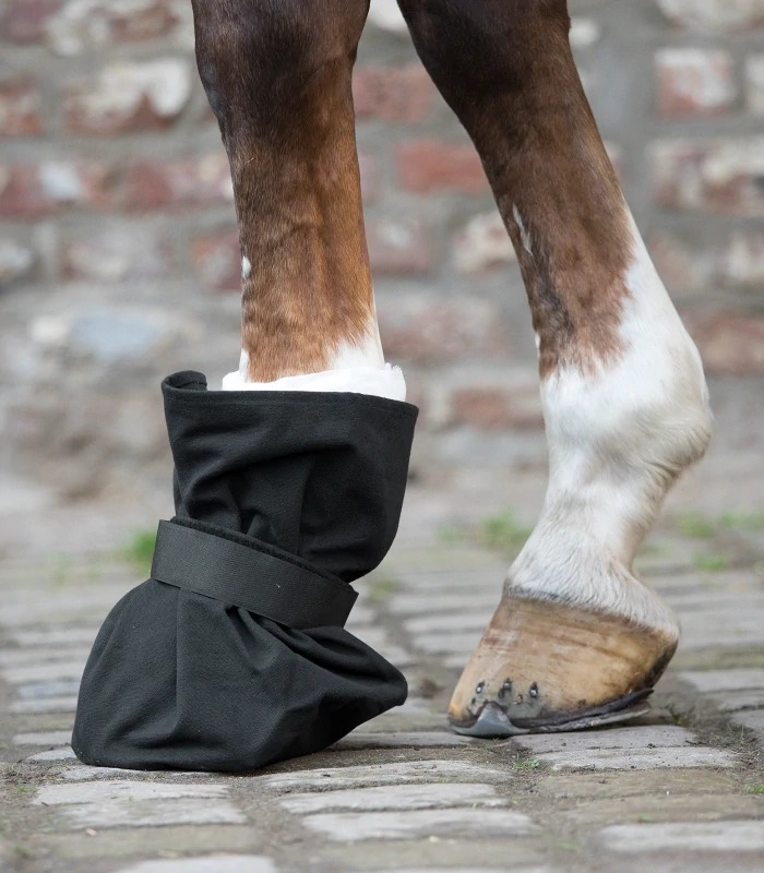 Odolný plátěný materiál s PVC podrážkou na ochranu obvazů na kopytech. Snadno se zapíná páskem na Velcro.