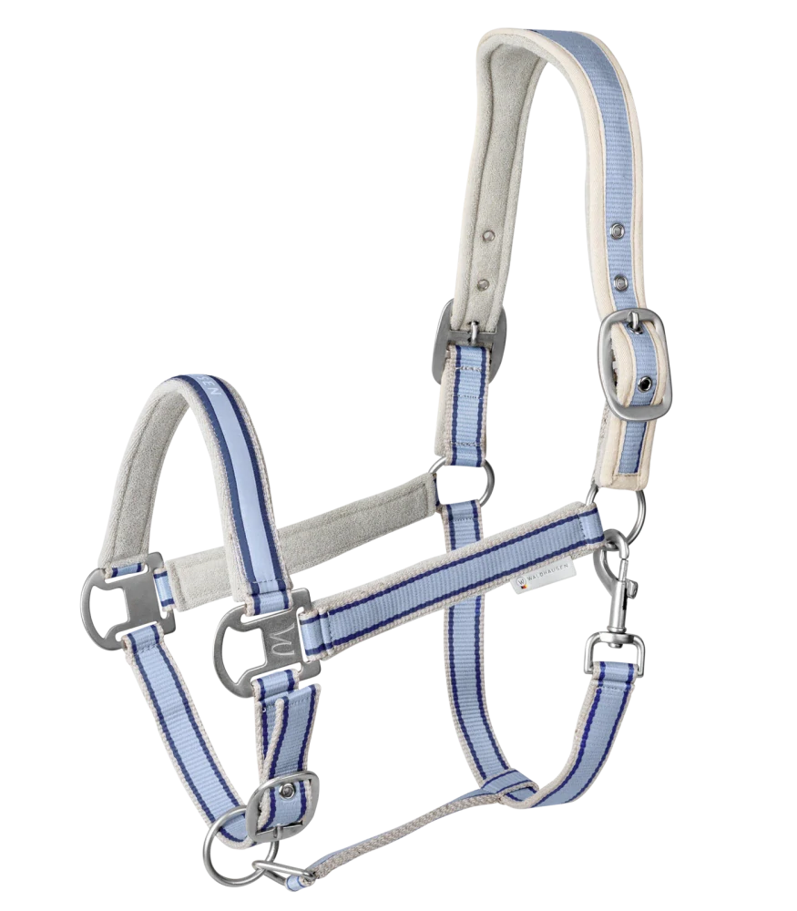 - Vysoce kvalitní ohlávka s měkkým polstrováním v oblasti krku a nosu, stejně jako na lících. Anatomicky tvarovaná pro pohodlné nošení. S kovovým kováním stříbrné barvy.