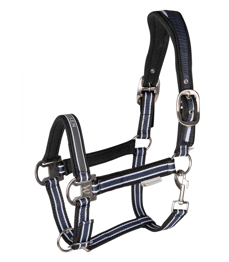 • Vysoce kvalitní ohlávka s měkkým polstrováním v oblasti krku a nosu, stejně jako na lících. Anatomicky tvarovaná pro pohodlné nošení.  S kovovým kováním stříbrné barvy.