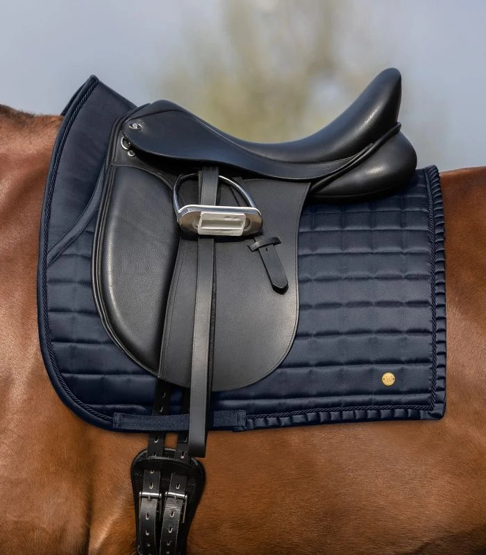 Elegantní podsedlová dečka s hedvábným efektem a volánovým lemováním. Pomocí dorazového polštáře a jednoduchého nebo děleného poutka na popruh je zabráněno sklouznutí sedla. Bambusová podšívka absorbující pot nabízí zvláštní pohodlí.