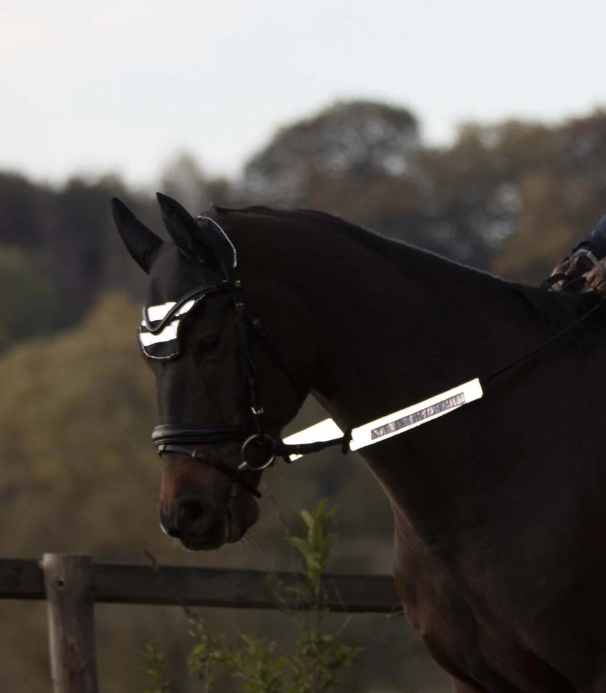 Sada 3 vysoce reflexních krytů se stříbrnými světelnými proužky. Velmi snadno se připevňuje na uzdečku a otěže.